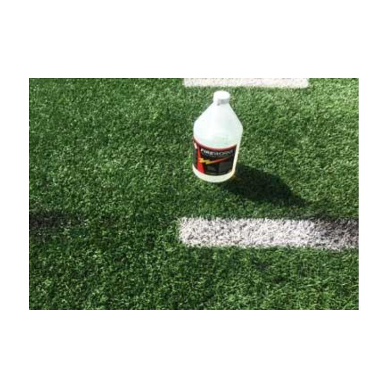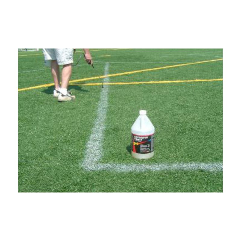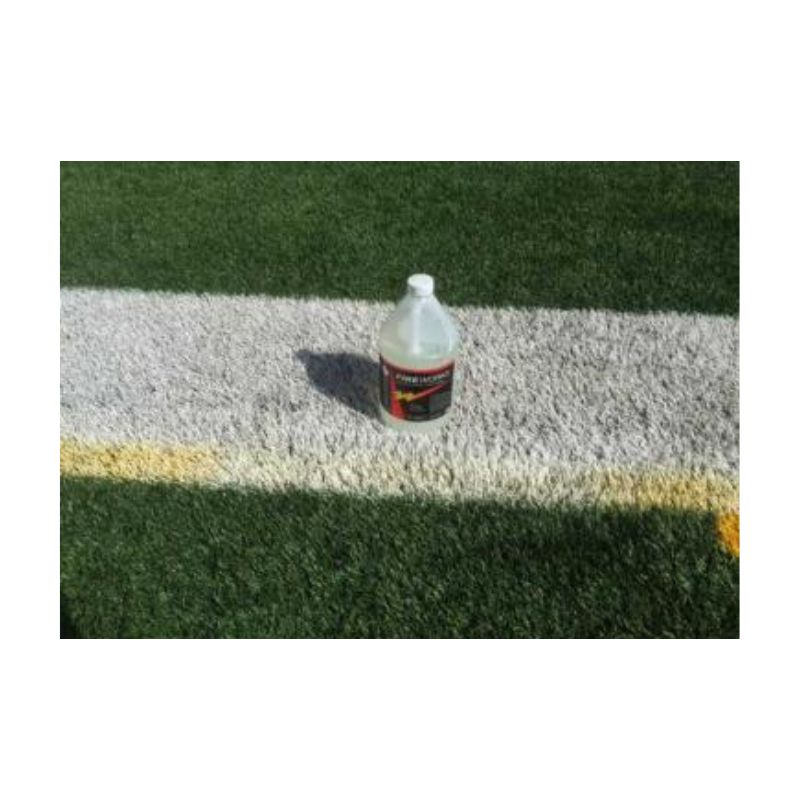 Formulated and manufactured by USSC, this water-based formula is designed to remove unwanted, old paint lines from synthetic artificial field turf. It will not hurt or damage the synthetic turf filaments or the rubber and sand infield filler. As with any chemical please wear protective gear to prevent getting the product or the product splatter on skin or eyes. Wear protective gloves, safety eyes glasses and appropriate shoes when applying or scrubbing the paint with this product. PAINTOFF remover can be used without dilution for maximum strength or can be diluted with 1 to 2 parts of water. Simply pour or spray the remover on the paint that needs to be removed. Let it soak for a few minutes to penetrate and start loosing up the paint. Then apply slight agitation to speed removal. Before the remover paint mixture dries, rinse and flush with water. The unwanted paint should be removed with one good application. For tough, hard to remove paints a second application, scrubbing and rinsing might be necessary.